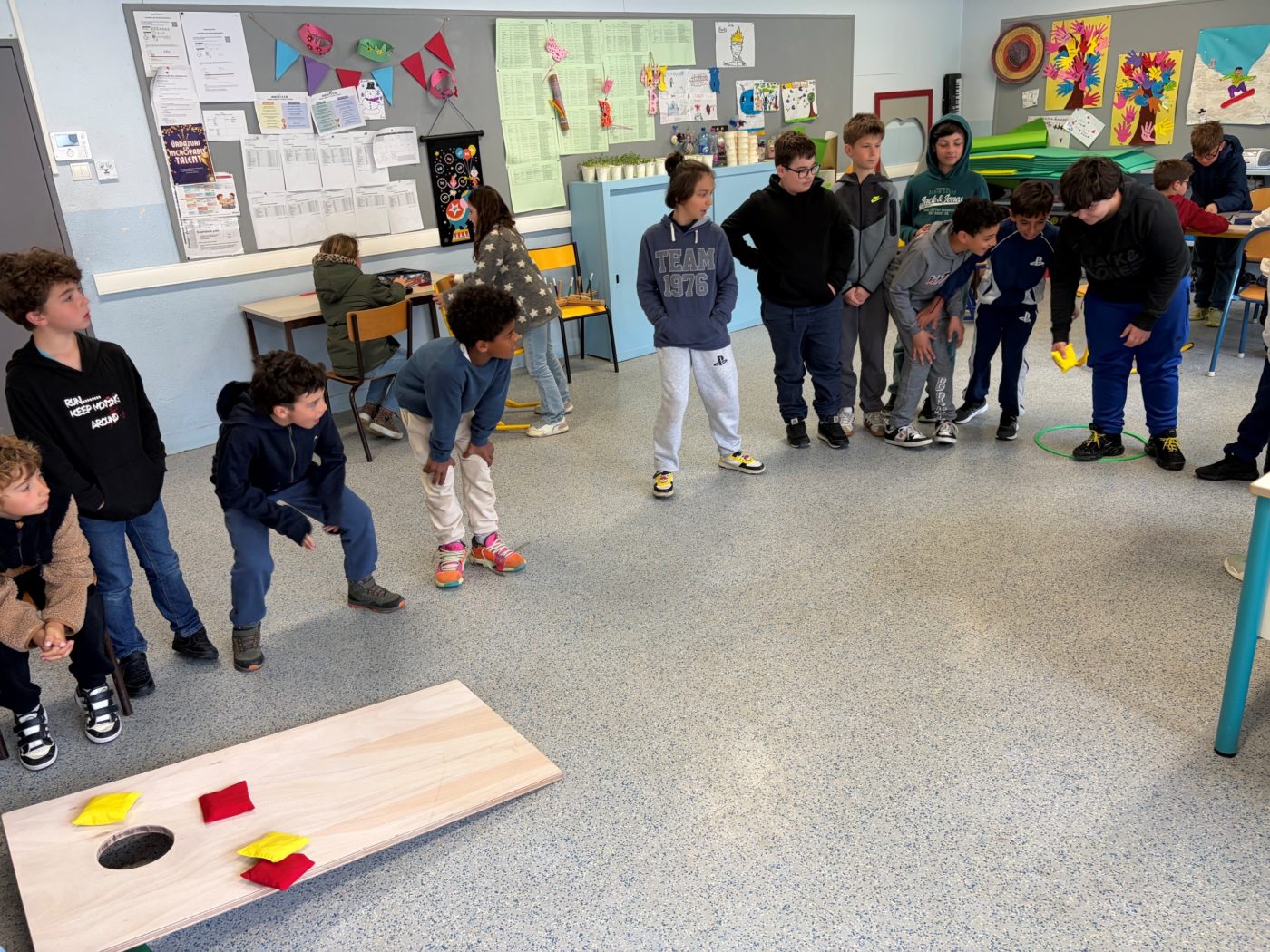 À Urdazuri, la construction d’un jeu de Cornhole a mêlé bricolage et défi sportif. Une fois installé, le jeu devient un terrain d’expérimentation : on ajuste, on recommence, on encourage les autres.