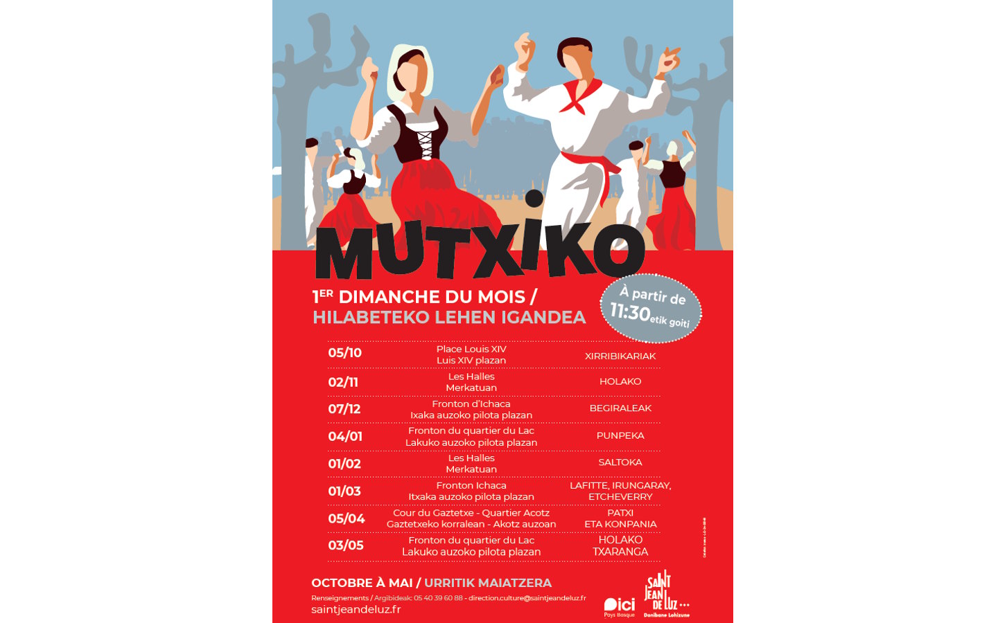 Animé par Punpeka.D’octobre à mai, chaque premier dimanche du mois à partir de 11h30, la tradition basque s’invite dans les rues et quartiers de Saint-Jean-de-Luz. Gratuits et ouverts à tous, les rendez-vous Mutxiko sont des moments festifs et conviviaux, qui font battre le cœur des habitants au rythme des danses traditionnelles.