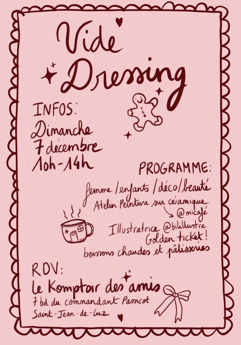 Un énorme vide dressing (vêtements femme, enfants, déco, déco de noël, produits de beauté…), mais aussi un atelier peinture sur céramique (proposé par MiCafé, le tout nouveau café céramique de Saint-Jean-de-Luz) et la présence de l’artiste locale Elina (illustratrice de Katxi Klothing qui présentera son nouveau projet : Bilillustre).