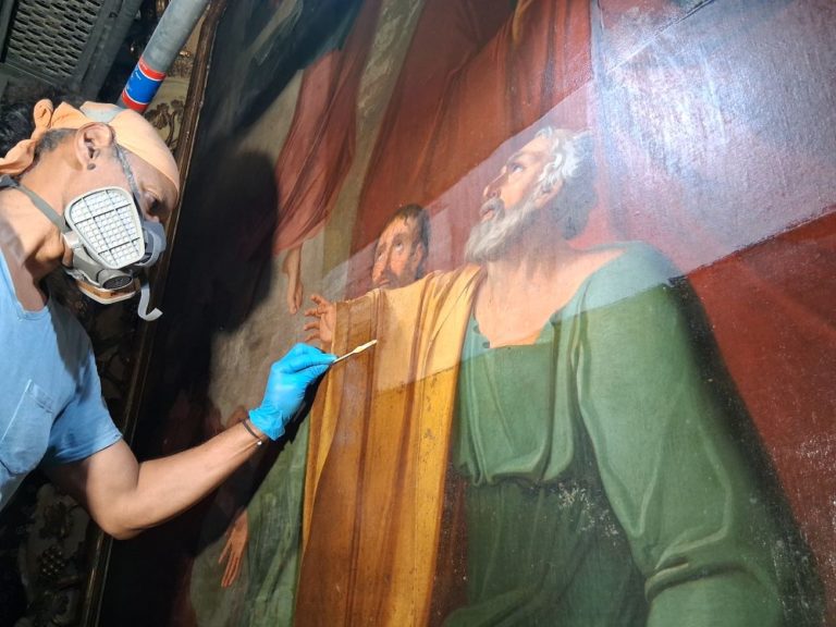 L’intervention en cours sur les deux toiles nécessite l’usage de solvants.