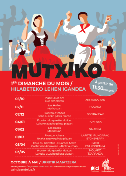 D’octobre à mai, chaque premier dimanche du mois, la tradition basque s’invite dans les rues et quartiers de Saint-Jean-de-Luz. Les rendez-vous Mutxiko, moments festifs et conviviaux, font battre le cœur des habitants au rythme des danses traditionnelles.