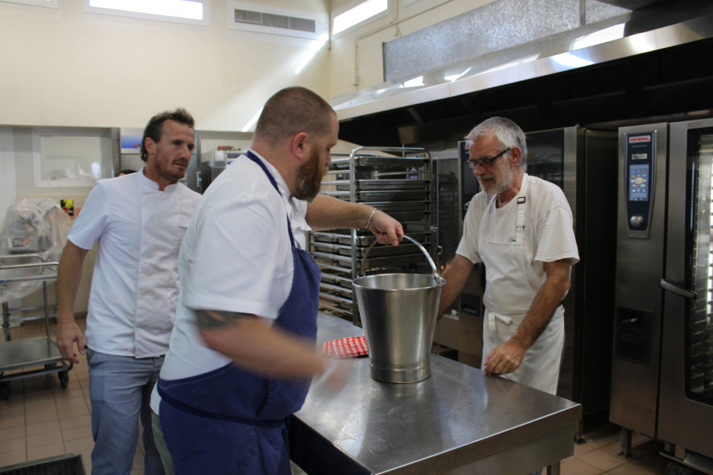 En cuisine, Bastien Soumoulou, chef du restaurant La Réserve, Cédric Marinello, chef du Bar Basque, et Bertrand Ducauroy, artisan boulanger de Etxe Goxoan, ont uni leurs talents le temps d’une journée.