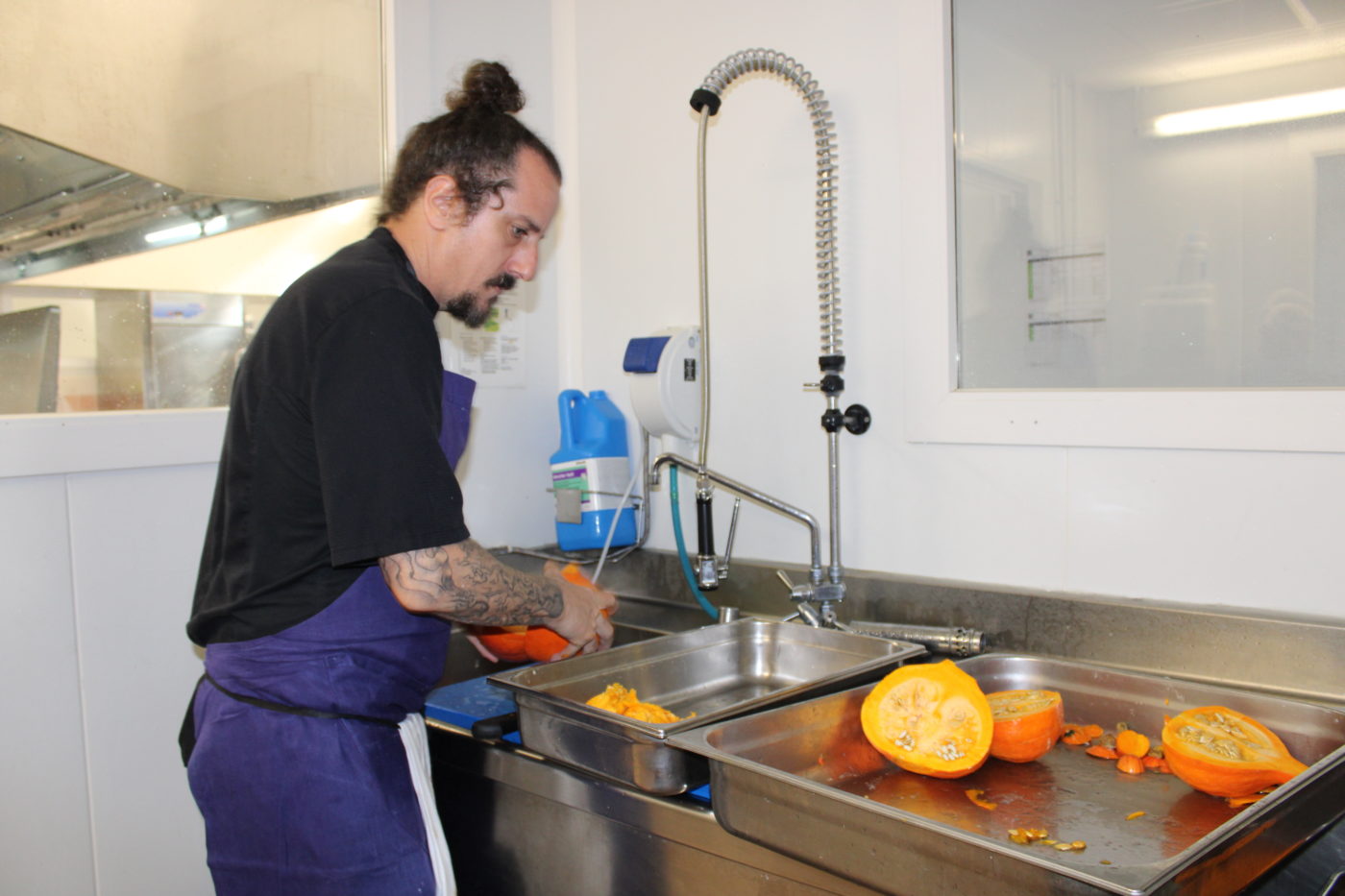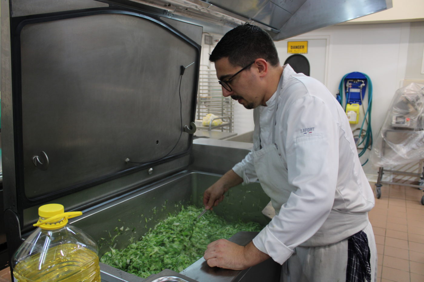 Jeudi 16 octobre, changement d’échelle : trois chefs luziens se sont retrouvés devant les pianos de la cuisine centrale municipale pour relever un défi d’envergure, préparer un repas complet pour les 600 élèves des écoles primaires publiques de la ville.