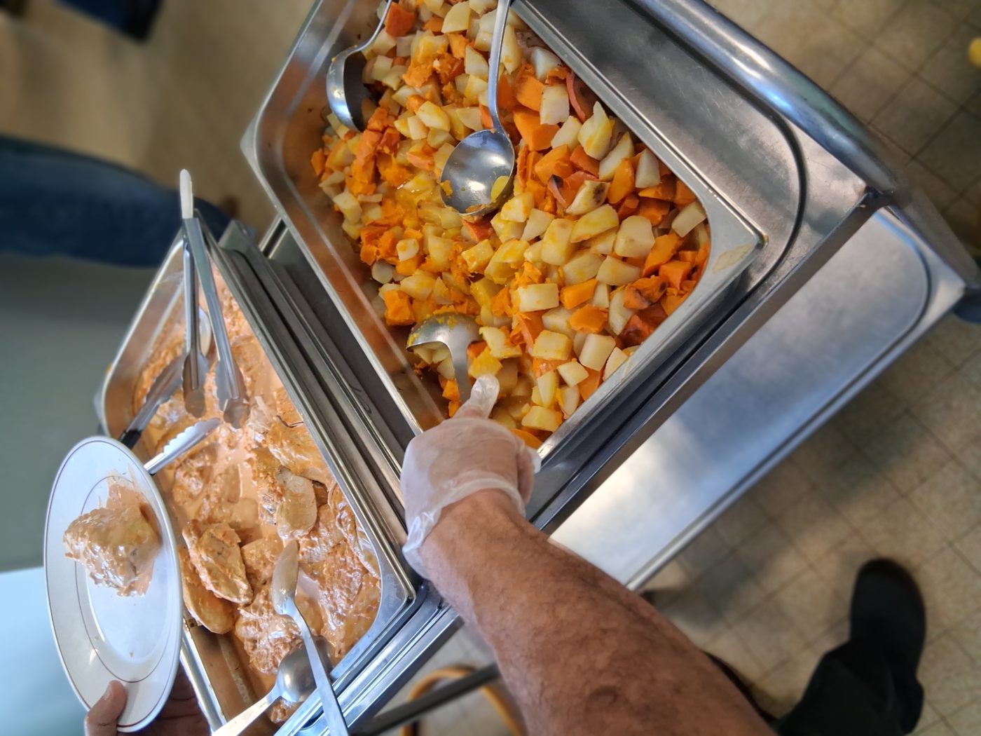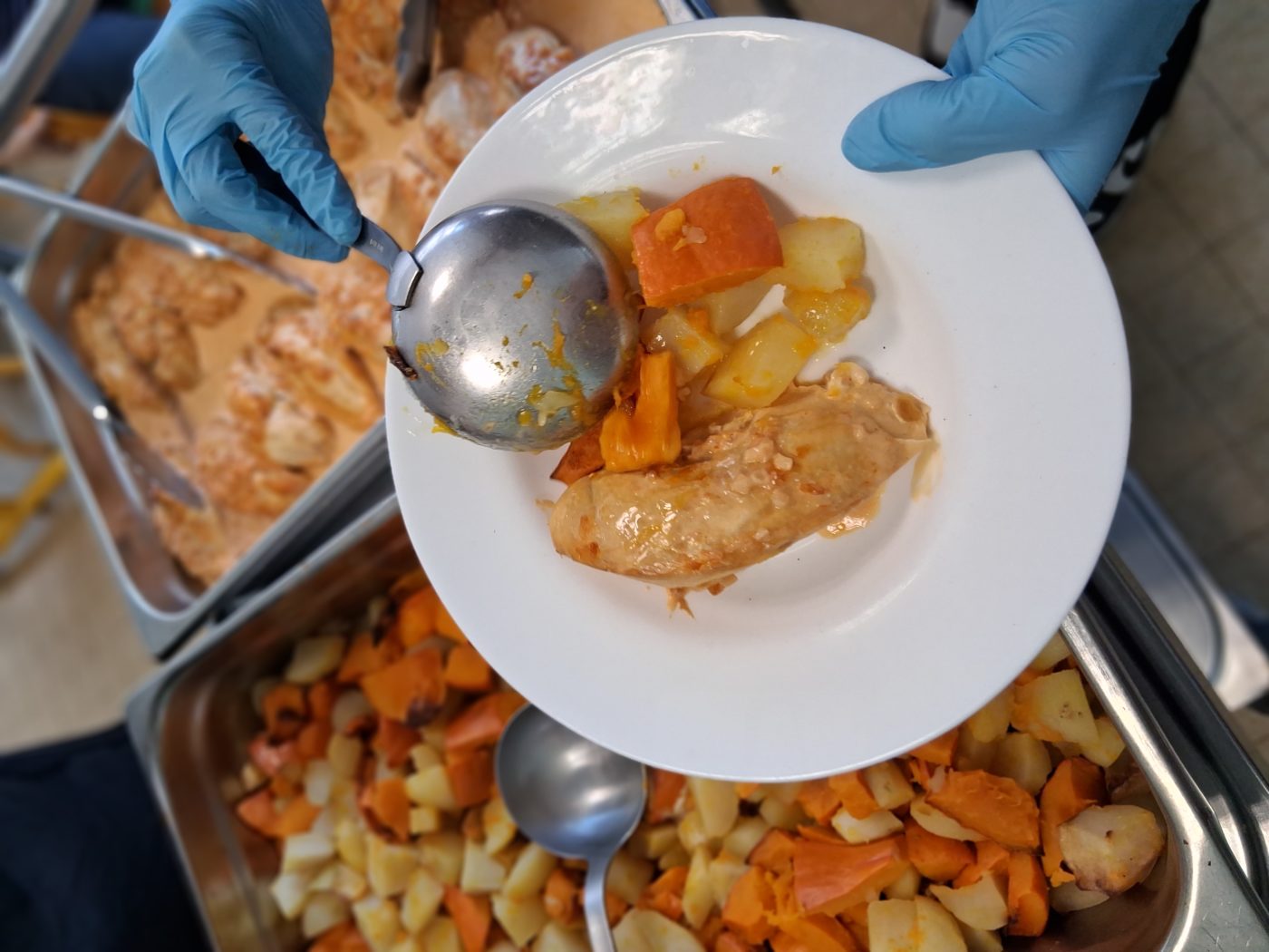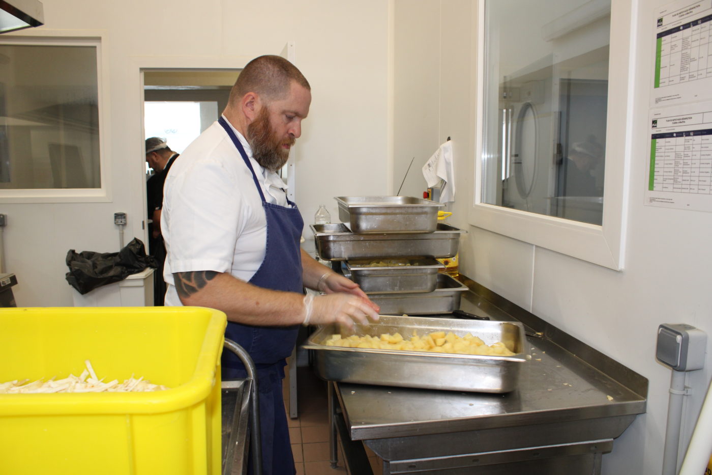 Au menu du jour : une flammekueche végétarienne en entrée, un duo de pommes de terre et potimarron accompagnant un blanc de poulet nappé d’une sauce au beurre blanc, avant de terminer sur une note sucrée avec une tartelette au chocolat, généreusement réalisée grâce au chocolat offert par Bertrand Ducauroy.