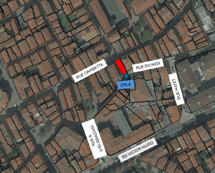 Des travaux de réfection de toiture entrepris au n°50 rue Gambetta vont nécessiter l’installation d’une grue rue du Midi entre le 28 avril et le 12 juin.